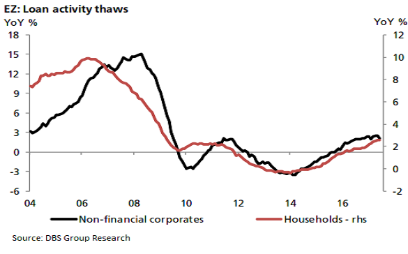 The European Central Bank’s accommodative policy stance continues to thaw credit growth. In Jun17, credit growth to households rose to 2.6 percent y/y, stable from month before but higher than last year’s average 1.7 percent. There are some concerns over a modest slowdown in lending to corporates to 2.1 percent from May’s 2.5 percent, but this is still an improvement from last year.