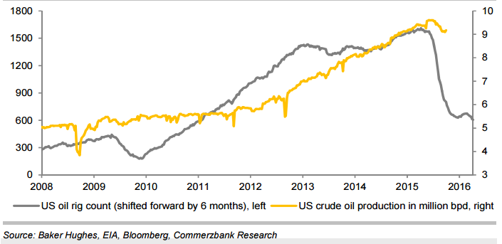 On the supply side, oil price has also been supported by production cuts. In particular, the number of active drilling rigs in the US has declined further and is now well below the trough seen in 2009. The rig count might start to pick up again in coming months as prices recover, but slower growth in non-OPEC supply should continue to support prices.