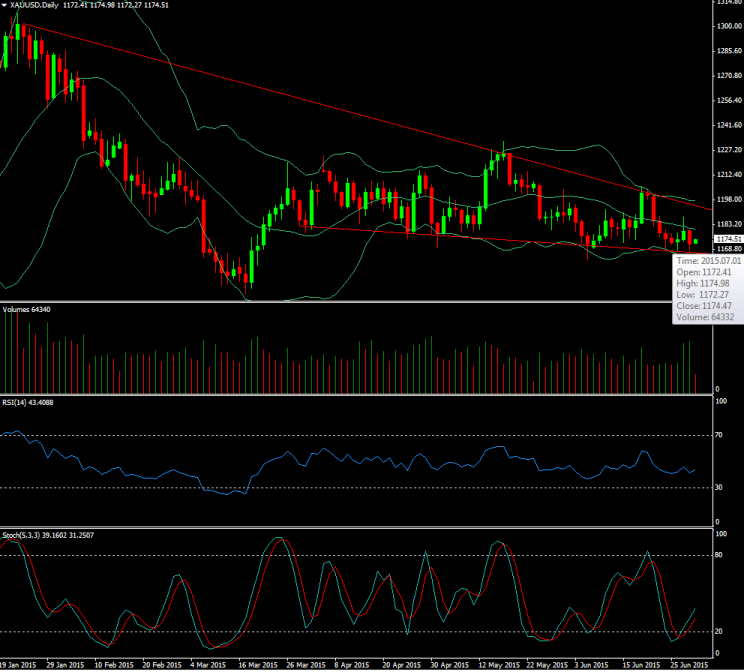 On the Comex division of the New York Mercantile Exchange, gold for August delivery was quoted at $1,174.20 a troy ounce.