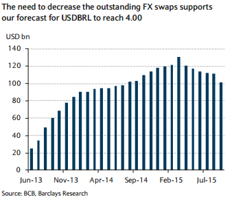 Currently, the central bank is rolling over all the contracts that are due to expire in the next few months, implying that the outstanding stock will soon have maturities beyond 2016. On the one hand, reducing this stock would decrease the fiscal costs that these operations incur when the exchange rate weakens, but on the other hand, it puts upside risks to inflation next year, says Barclays.