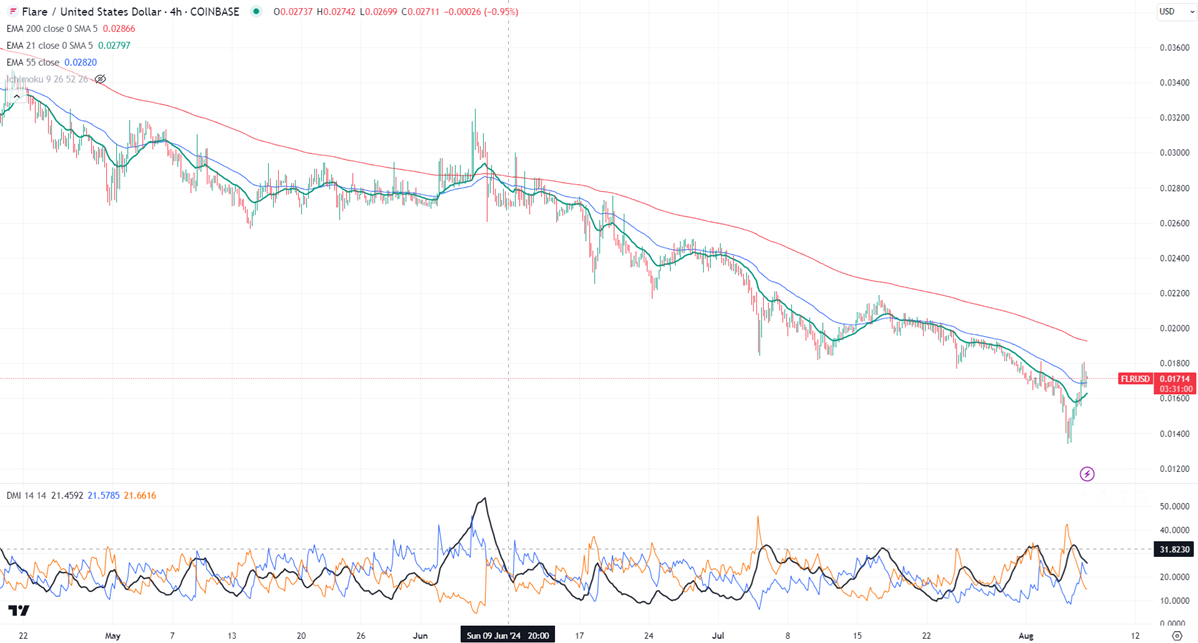 FLRUSD gained more than 35% in the past two days. The pair holds above the short-term (21 and 55 EMA) and below the long-term moving average in the 4-hour chart. It hit a high of $0.0180 and is currently trading around $0.01725.