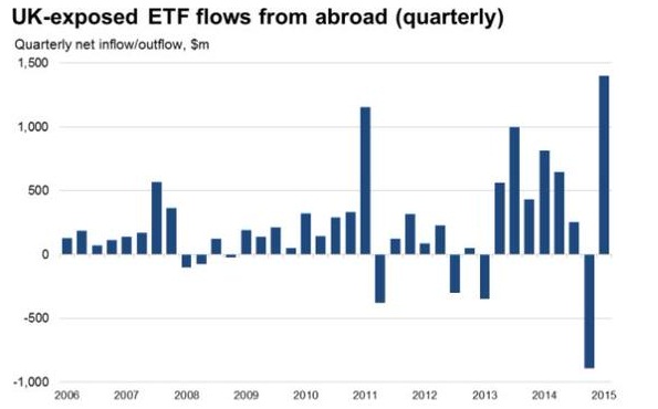 - As per Markit intelligence, foreign investors increased their exposure to UK stocks. Latest data suggests investors poured in $1.5 billion in the first quarter towards UK exposed ETFs. Flow is largest since at least 2006.