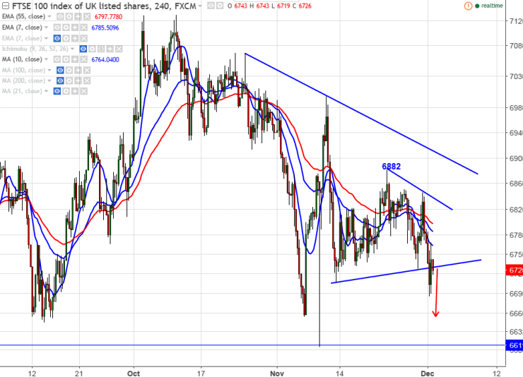FTSE100 breaks trend line support at 6720, decline till 6525 likely