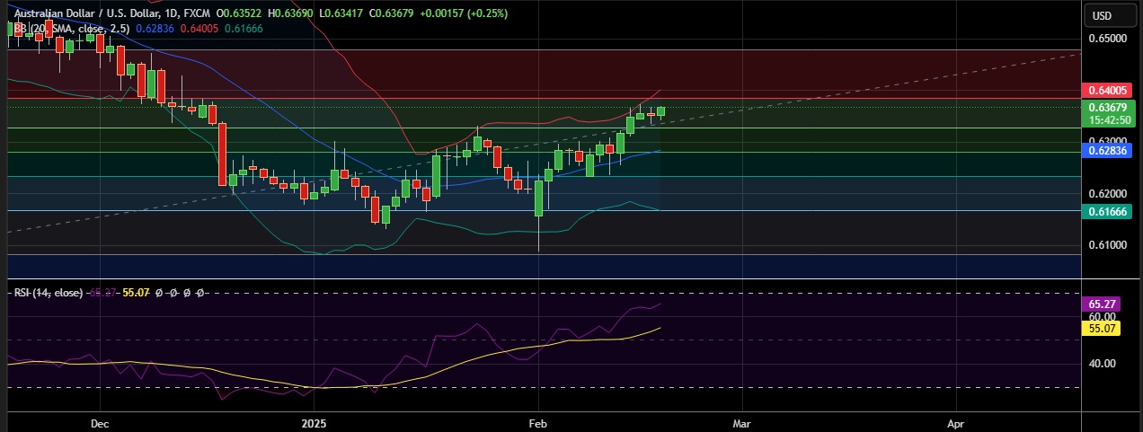 • Immediate resistance is located at 0.6385(23.6%fib), any close above will push the pair towards 0.6400(Higher BB).