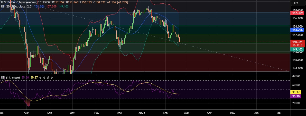 • Support is seen at 150.08(38.2%fib) and break below could take the pair towards 149.05 (Lower BB)