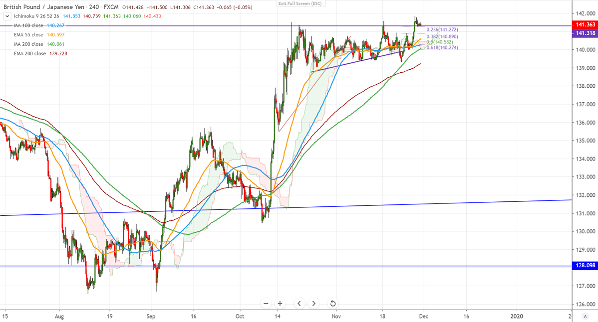 GBPJPY is consolidating after hitting a fresh 6-month high at 141.85 on Nov 27th, 2019. The US has supported Hong Kong's protests by Trump signing the HK Human Rights and Democracy act bill. Any retaliation from China will have a major impact on the US-China trade deal.