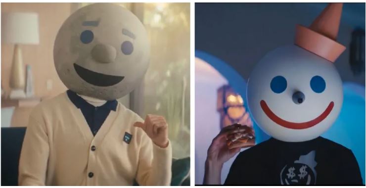 According to Jack in the Box, Moon Man could be mistaken for Jack, its 70-year old mascot, since it also has a" spherical white head affixed to a talking human actor, with blue-dotted eyes, a nose, and a smile."