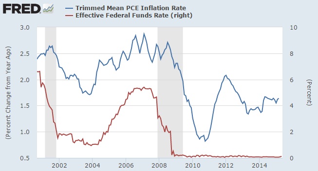 - Last time first rate hike came in June 2004, when trimmed mean PCE inflation reached almost 2.3%.