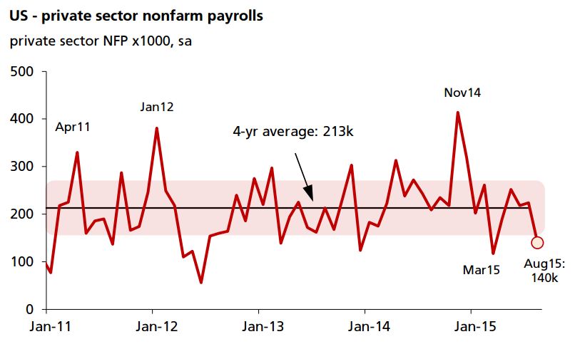 "We're not too concerned about it - the 140k in August is probably just normal volatility. But it underscores the fact that all the Fed talk last year about 'better job growth' wasn't based on the data, it was just talk," DBS Bank says.