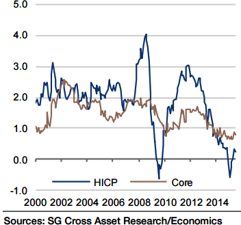 "Looking ahead, euro area HICP inflation is expected to average 0.3% in 2015 and 1.5% in 2016, while the core metric should remain stable at 0.8% in 2015 and 1.1% in 2016", added Societe Generale.