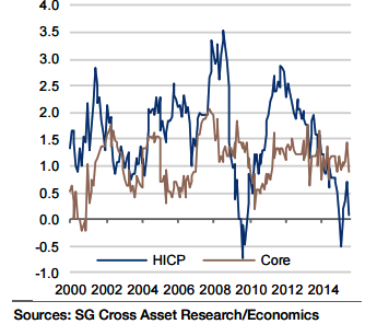 "Looking ahead, German HICP inflation is expected to average 0.3% in 2015 and 1.3% in 2016, while the core metric should average 1.1% in 2015 and 1.3% in 2016", forecasts Societe Generale.