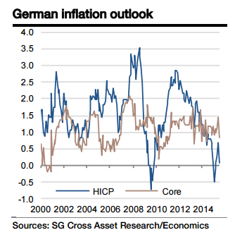 "We expect German HICP inflation to average 0.3% in 2015 and 1.7% in 2016, while the core metric should average at 0.9% in 2015 and 1.2% in 2016," says Societe Generale.