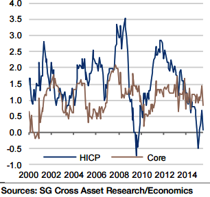 "Looking ahead, German HICP inflation is expected to average 0.3% in 2015 and 1.7% in 2016, while the core metric should average at 0.9% in 2015 and 1.2% in 2016", says Societe Generale.