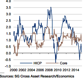 "Looking ahead, German HICP inflation is expected to average 0.3% in 2015 and 1.5% in 2016, while the core metric should average 1.1% in 2015 and 1.4% in 2016", added Societe Generale.