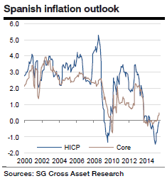 "Looking ahead, Spanish HICP inflation should remain in negative territory until the end of the summer, averaging -0.5% for 2015 and 0.9% in 2016. The core metric should be 0.2% in 2015 before rising to 0.9% in 2016", estimates Societe Generale.
