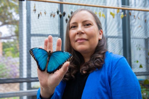 Adriana Briscoe holding a Morpho peleides butterfly, also known as a blue morpho, in the greenhouse at the University of California, Irvine. Wes Koseki - UCI School of Biological Sciences