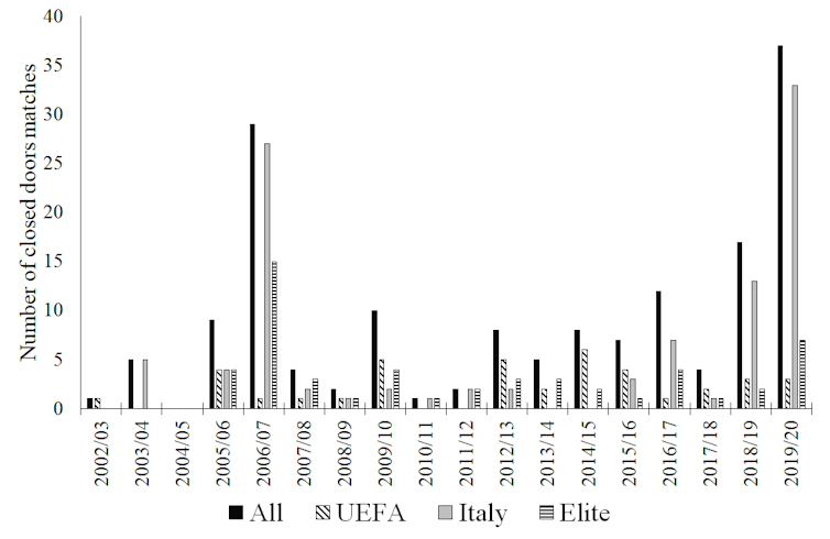Historically, most closed doors matches have been imposed on clubs and their fans as a punishment – for violence, racist abuse and corruption. Studying the history of European football since the second world war, we found 191 closed doors matches across the top Italian and French leagues, and in European club competitions. We found none in the English and German top leagues, and only one in Spain’s La Liga. Most of these matches were after 2002.