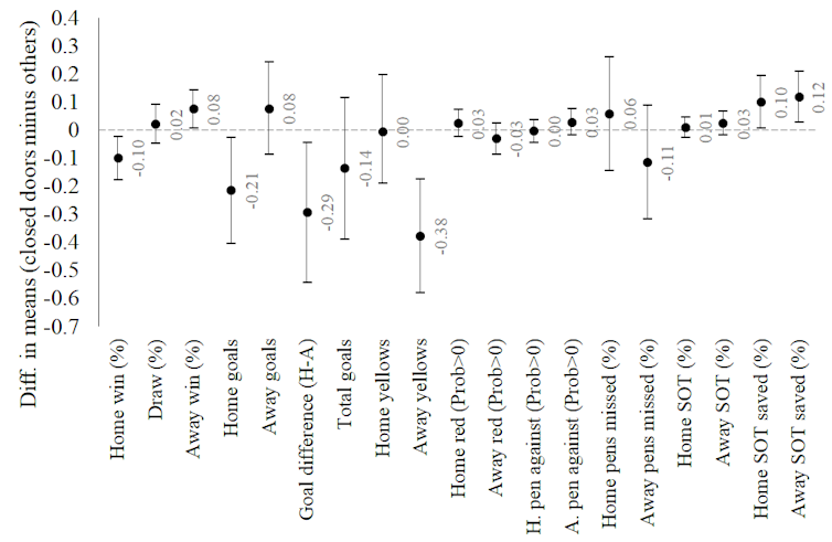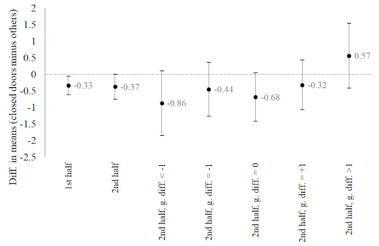 The outcomes in closed doors matches vs in all others since the beginning of the 2002-03 European football season. Bands show 95% confidence intervals. Carl Singleton, Author provided