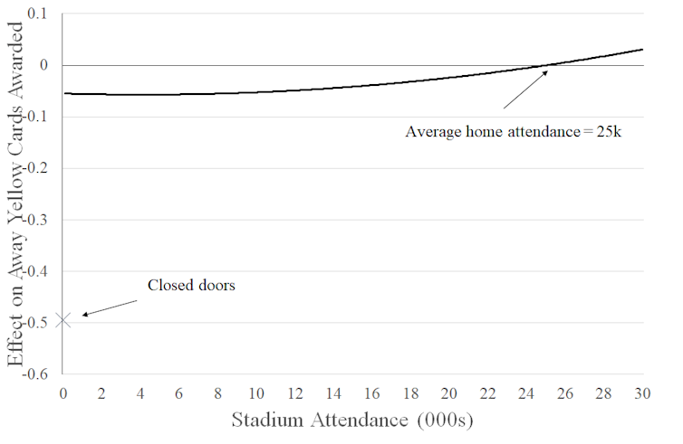 The data suggests at least two reasons for the loss of home advantage. The first is that away teams get punished differently by the referee. Small changes in the number of fans in the stadium normally have small effects. But as the graph below shows, we estimate that an away team would receive 0.5 fewer yellow cards when playing behind closed doors (the X on the diagram), whereas the effect of reducing a specific stadium’s 25,000 crowd down to a 6,000 one is a mere 0.05 of a card (black line on diagram). Closed door matches have a disproportionate and strong effect on yellow cards.