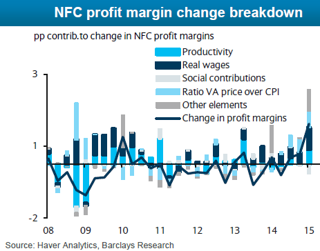 - Government measures (tax credit + responsibility pact) have improved NFCs' profit margins - although these are one-offs. Further labour market reforms are needed to realign real compensation with productivity.