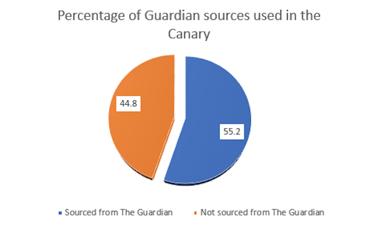 In June 2018 we conducted an in-depth quantitative analysis of the Canary and its journalistic sources. The study – tracking every article published over a ten-day period – revealed that in ostracising the Guardian, the Canary is, in effect, amputating a vital organ. Our study found that more than half of the Canary’s stories (55.2%) contained material that had actually originated in the Guardian. This can range from a link back to an earlier Guardian article, to provide background or context: to more substantial references that reuses statistics, facts and full quotes from previous Guardian articles.