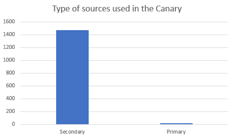 But the issue goes deeper. Despite the Canary’s well-publicised mistrust of the “MSM”, our study reveals that the blog routinely recycles its content from across the media. The study revealed that of the 1,471 sources of information that we identified, just 18 (1.2%) were primary sources (that is, material gathered exclusively by journalists working for the Canary). When statements from unnamed sources (typically spokespeople in written statements and press releases) were further stripped out – just 0.6% of the Canary’s material came from actual interviews.