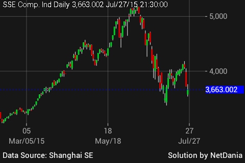 After 8.48% plunge on Monday market opened 4% lower and at point was down about 5%, and finally recovered due to state buying. Benchmark index, Shanghai Composite closed at 3663, down -1.68% for the day.