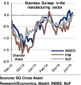 "Going forward, business sentiment is expected to steadily improve. However, the uncertainty from Greece is likely to cap any substantial improvement. The current level is just below the historical average of 100", says Societe Generale.