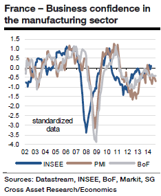 The hope is that tax cuts and lower oil prices will start to boost profit margins by the end of 2015, and in particular in the manufacturing sector. However, French business leaders still need to be convinced that these positives can also materialise into sustainable growth, which is likely to cap improvement in business confidence.