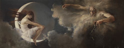 There are no werewolves in Geelong, but there is a blend of fantasy, the domestic and the ancient. There is Arthur Loureiro’s painting Study for The spirit of the New Moon (1888), inspired by an epic poem in which the goddess Venus wards off the dangerous seas allowing safe passage for the explorer Vasco de Garma.