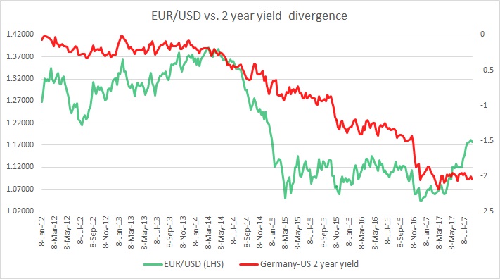 The chart above shows, how the relationship between EUR/USD and 2-year yield divergence has unfolded since 2012. It is evident that these short rates have been a key influencing factor for the pair as policy divergence became evident since 2013.