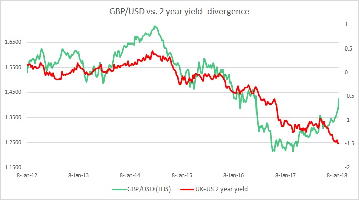 The chart above shows, how the relationship between GBP/USD and 2-year yield divergence has unfolded since 2012.