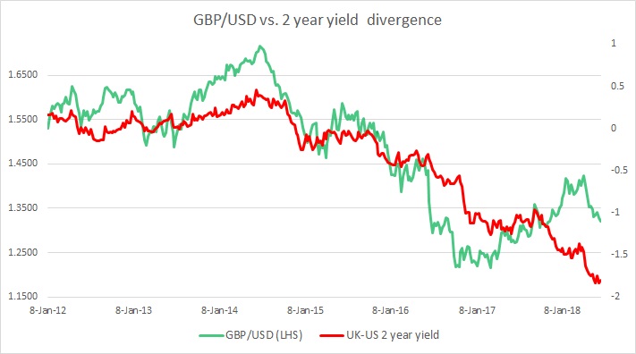The chart above shows, how the relationship between GBP/USD and 2-year yield divergence has unfolded since 2012.
