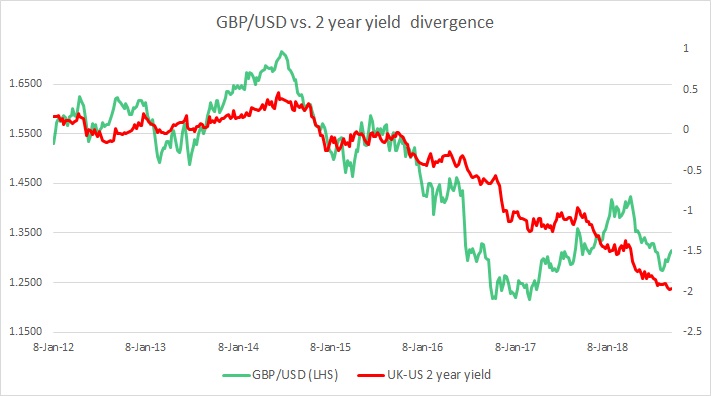 The chart above shows, how the relationship between GBP/USD and 2-year yield divergence has unfolded since 2012.