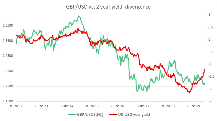 The chart above shows, how the relationship between GBP/USD and 2-year yield divergence has unfolded since 2012.