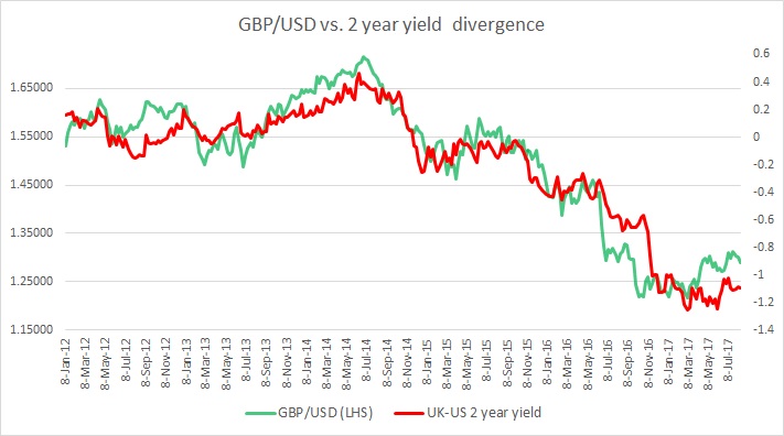 The chart above shows, how the relationship between GBP/USD and 2-year yield divergence has unfolded since 2012.