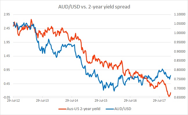 - It can be seen even with a naked eye, that the pair and the yield spread between 2-year treasury and 2-year Australian government bond have enjoyed a very close relationship.