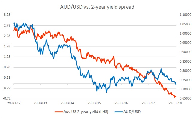 - It can be seen even with a naked eye, that the pair and the yield spread between 2-year treasury and 2-year Australian government bond have enjoyed a very close relationship.