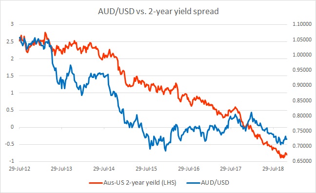 The chart above makes a clear case of closeness between the rate spread and the exchange rate. The spread between the 2-year U.S. Treasuries and the 2-year Australian government bond declined from +253 bps to -72 bps. AUD/USD responded by declining from 1.056 area to 0.729 area.