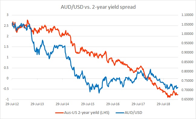 The chart above shows, how the relationship between AUD/USD and 2-year yield divergence has unfolded since 2012.
