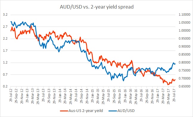 - It can be seen even with a naked eye, that the pair and the yield spread between 2-year treasury and 2-year Australian government bond have enjoyed a very close relationship.