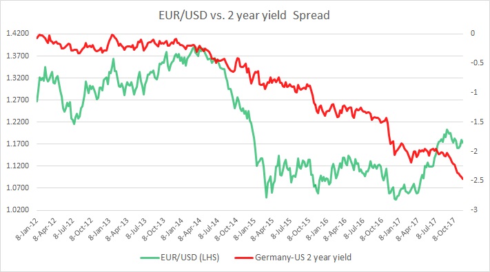 The chart above shows, how the relationship between EUR/USD and 2-year yield divergence has unfolded since 2012. It is evident that these short rates have been a key influencing factor for the pair as policy divergence became evident since 2013.