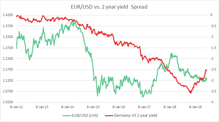 - The chart clearly shows the close relationship between the yield spread and the exchange rate. Since December 2013, the yield spread declined from -0.2 percent area to -3.56 percent area by November 2018, and EUR/USD declined from 1.38 to 1.13 area.