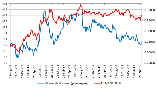This chart shows the performance of the EUR/GBP exchange rate in contrast to the performance of long-term yield divergence between 10-year German bund and 10-year UK gilt.