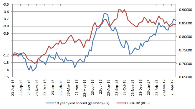 This chart shows the performance of EUR/GBP exchange rate in contrast to the performance of long-term yield divergence between 10-year German bund and 10-year UK gilt.