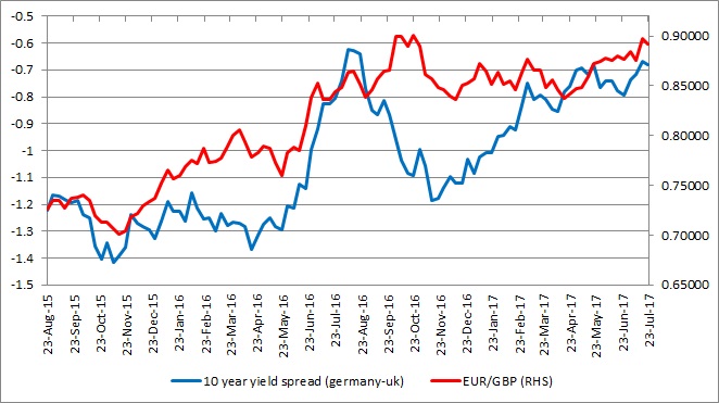- During our evaluation period beginning August 2015, we can see that long-term yield difference between the German bund and UK gilts are somewhat going hand in hand with the EUR/GBP exchange rate. While the yield spread topped in late August last year, the EUR/GBP exchange rate moved higher to peak in early October around 0.92 area.