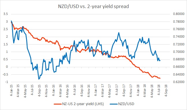 In July, the spread further widened by 7 bps to -74 bps and the NZD/USD responded by declining 200 pips to 0.677 area against the USD.