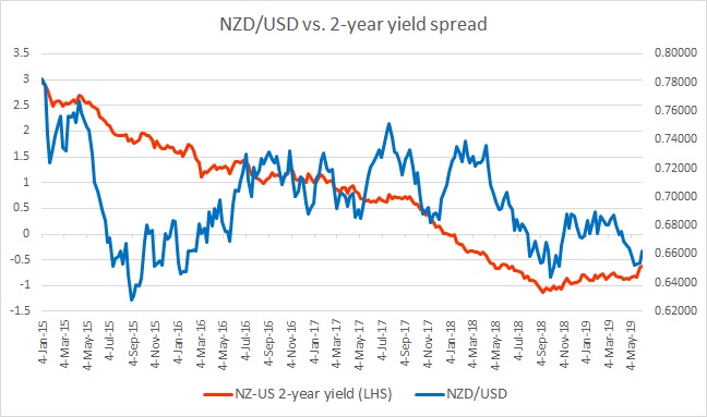 The chart above shows, how the relationship between NZD/USD and 2-year yield divergence has unfolded since 2015.