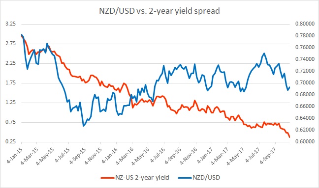 The chart above shows, how the relationship between NZD/USD and 2-year yield divergence has unfolded since 2015.