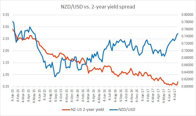 The chart above shows, how the relationship between NZD/USD and 2-year yield divergence has unfolded since 2015.
